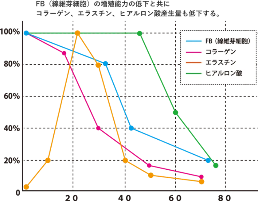 加齢と共にFBが低下し、FBが産生するコラーゲン、エラスチン、ヒアルロン酸の産生量が減少することがわかっています。