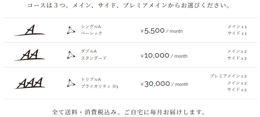 サービスは「A」(シングルエー)「AA」(ダブルエー)「AAA」(トリプルエー)の3種類があり、目的に合わせて選んだメディカルサプリメント、メディカルコスメがお得な価格で自宅に毎月届きます。