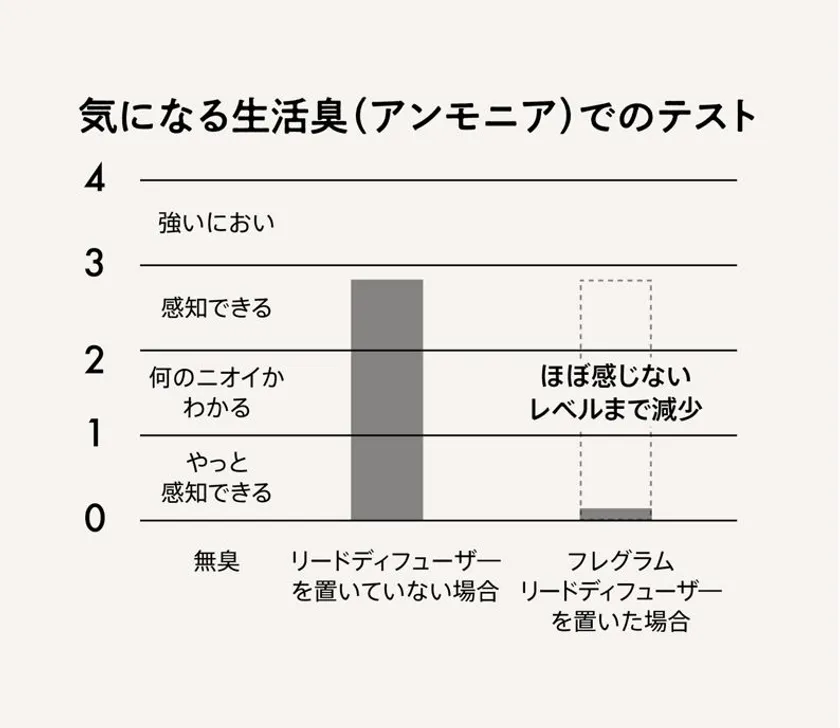 消臭効果の試験結果では、気になる生活臭(アンモニア)が30分程度でほぼ感じないレベルまで減少。いやなニオイを消しながら香りづけするので香りが混ざることを気にせずお部屋の香りを楽しんでいただけます。