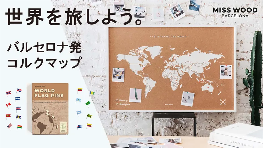 “冒険は今日から始まる!(Your ADVENTURE begins TODAY.)”を標榜するバルセロナのブランドMiss Wood。ヨーロッパで人気のこのブランドがこの度、日本へ初上陸します。彼らのベストセラーである「コルク世界地図」はシリーズ累計で、20万個以上を販売。ヨーロッパを中心に800以上ものショップで販売されています。旅を愛するMiss Woodはインスタでの「冒険」を発信しつづけており、そのフォロワー数は、9万6千人に上ります。JaviとAlbertの二人の創業者が考えたこの「コルクマップ」には、2人の工夫が込められています。「行きたい場所(Place to go)ピン」と「行ったことがある場所(have been)ピン」を色分けしてデコレーションする、国旗を立てて楽しむ等、2人冒険者のこだわりは商品の細部に宿っています。