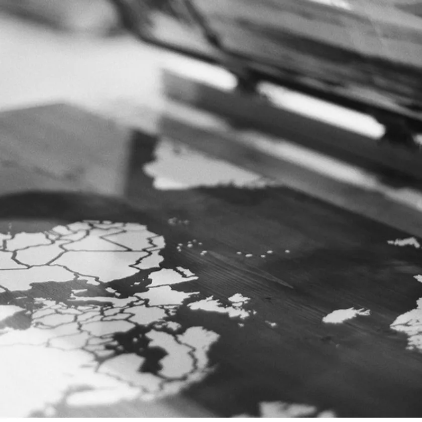【コルクマップ】の地図はシルクスクリーン版画によるハンドメイドです。シルクスクリーン版画は孔版画とも呼ばれ、美術作品にも使われる印刷技法です。網目のある布を用い、その上に顔料を通さない型紙を敷いて印刷したい対象に当て、上からヘラで顔料を落とすことで、凹凸がある対象物でもきれいに印刷ができます。シルクスクリーン版画は専門の職人による高い技術が必要なため、バルセロナにある自社工房で職人が1枚1枚丁寧に仕立てています。