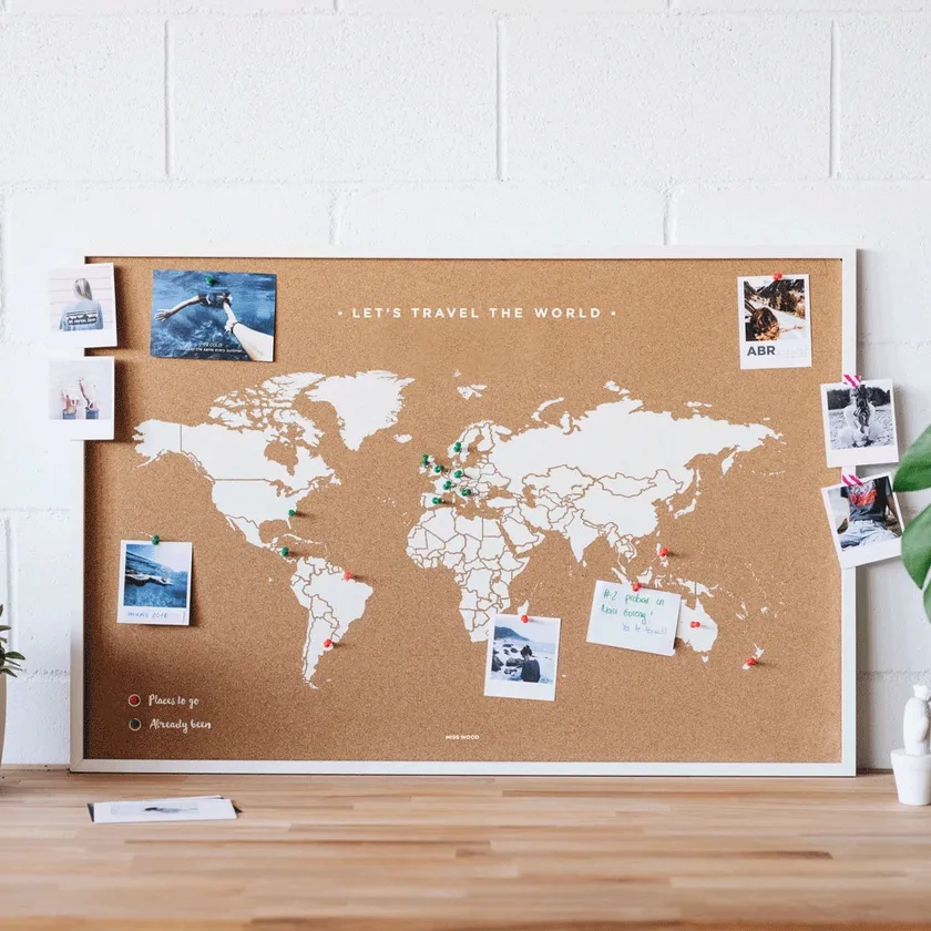 眺めるだけで旅へのロマンが掻き立てられる大型の世界地図が描かれたナチュラルインテリアとしての『コルクマップ』。温もりが感じられるコルクシートに描かれているので、旅の思い出の写真や行きたい場所をピン留めでき、オリジナルのインテリアにアレンジできます。
