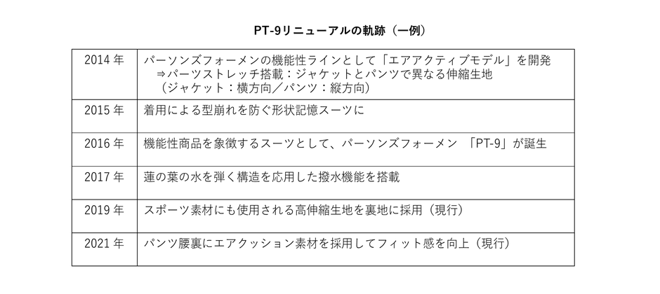 「PT-9」のPTは、機能性商品カテゴリーの総称として訴求する打ち出しネームである「PRESTIGE TECHNOLOGY(プレステージ テクノロジー)」の略で、多機能性を表すため数字のなかで最も大きな「9」を組み合わせて「PT-9」と名付けました。「スーツは堅苦しい」というイメージを払拭するため、これまでの商品作りのノウハウを生かし、「スーツをラクに着たい」というお客様の声を基に開発しました。特に着心地の良さにこだわり、長く愛用してもらえる商品となるよう、毎シーズン改良を行っています。当社が掲げてきたのは「スーツをもっと馴染みのあるものに」という想いです。「PT-9」にはその想いが反映されています。外見はきちんとした王道のスーツスタイルでありながら、中身はスポーツウェアのように軽やかで動きやすい快適な着心地を体感いただけます。