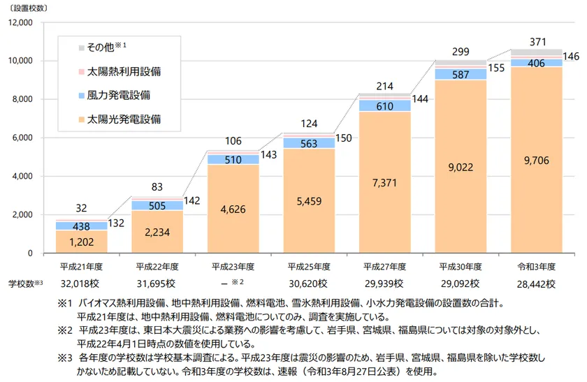 政府は、公立小中学校の校舎の脱炭素化に向けた検討に乗り出し、その手段の有力な一つとして太陽光発電が推進されています。文部科学省の再生可能エネルギー設備等の設置状況に関する調査結果によると、令和3年の公立の小中学校における太陽光発電設備の設置率(※1)は、34.1%に達しました。風力・太陽熱など再生可能エネルギー設備等を設置している学校の中で、90%以上は太陽光発電設備を設置しています。