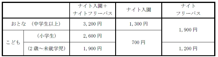 「ナイト入園」、「ナイト入園+ナイトフリーパス」はオンラインチケットサイト「アソビュー !」と「ローソンチケット」限定で販売いたします。
