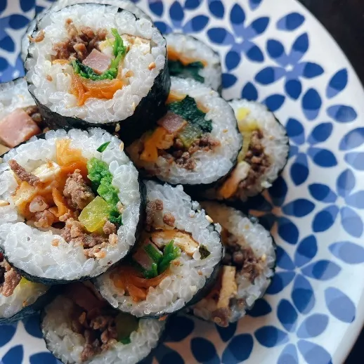 ごま油の香りが食欲をそそる韓国の海苔巻き。たくさんの野菜を使って見た目も鮮やか。パクっと食べやすいメニューです。