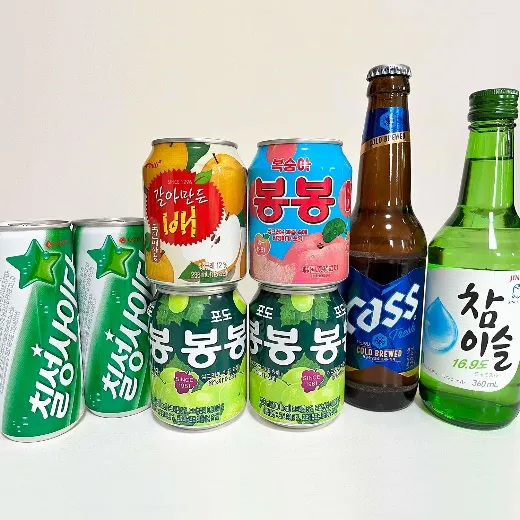 韓国ビールやチャミスル、ボンボンジュース、チルソンサイダーなどを取り揃えております。