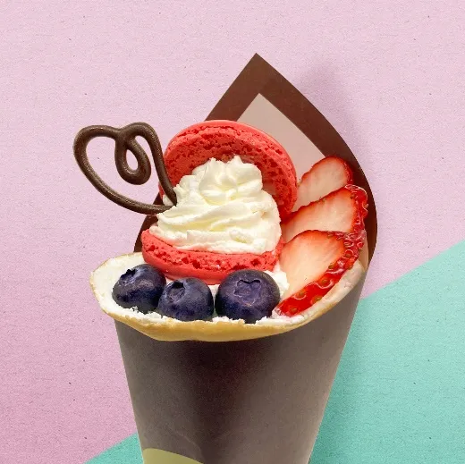 韓国で人気の太っちょマカロン(トゥンカロン)をクレープにトッピング!イチゴとブルーベリーを合わせた見た目もかわいい一品です!