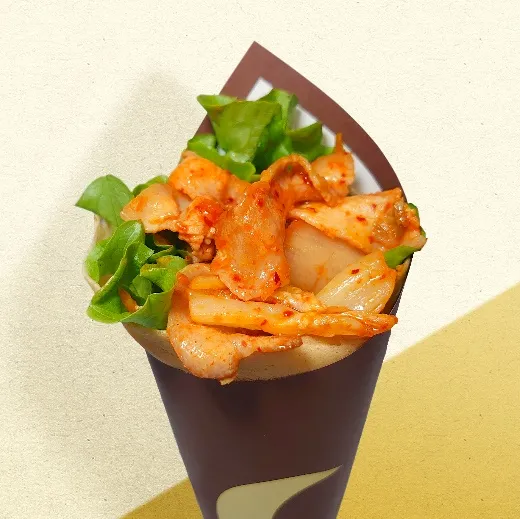 自慢の甘めの生地とレタスで、豚キムチを包み込みました。甘さと辛さのバランスが絶妙な一品です。食べごたえも十分!
