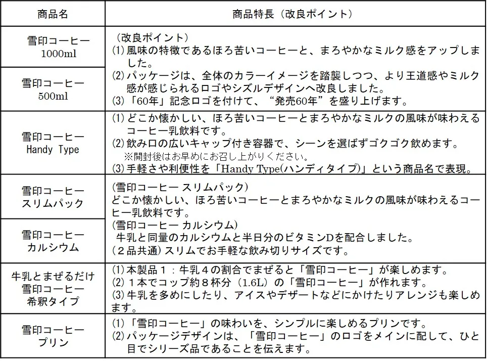 ・『雪印コーヒー』(1000ml、500ml)は、まろやかなミルク感をアップし、ミルクとコーヒーの風味がそれぞれ引き立つようにコーヒーを調整することで、雪印コーヒーの特徴であるほろ苦いコーヒー風味とまろやかなミルクの風味がより味わえる仕立てにしました。パッケージも、おなじみの「雪印コーヒー」らしく、よりミルク感が感じられるデザインにしました。