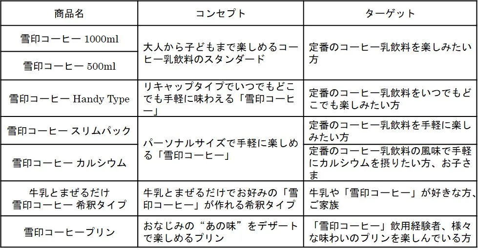 ・『雪印コーヒー スリムパック』、『雪印コーヒー カルシウム』(各200ml)は、小容量を手軽に飲みたいニーズや、牛乳と同量のカルシウム入りで、お子様への飲用を提案します。