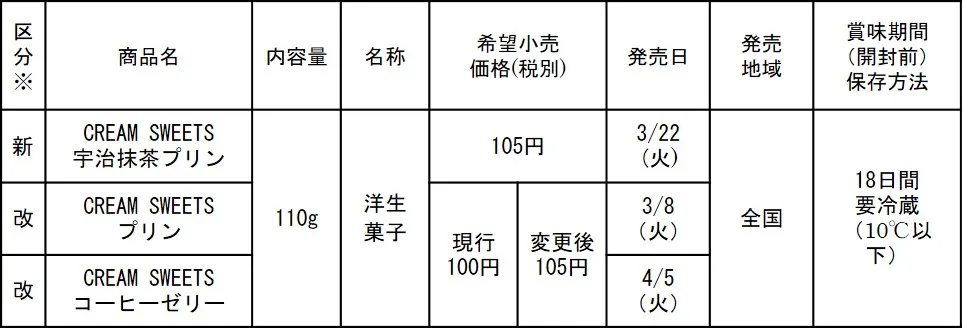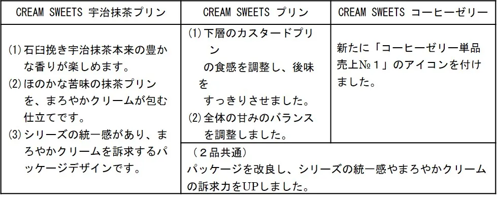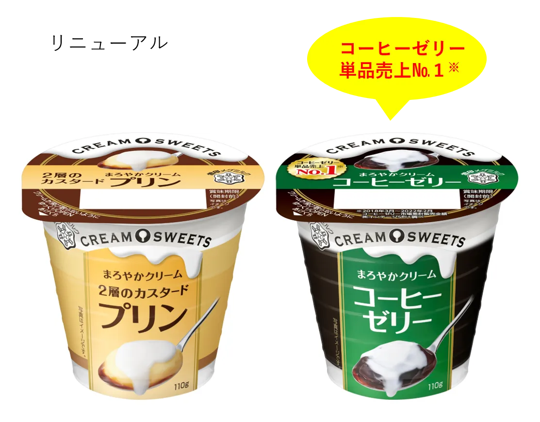 また、シリーズ品である、『CREAM SWEETS プリン』(110g)を同3月8日(火)、『CREAM SWEETS コーヒーゼリー』(110g)を同4月5日(火)より、全国でリニューアル発売いたします。