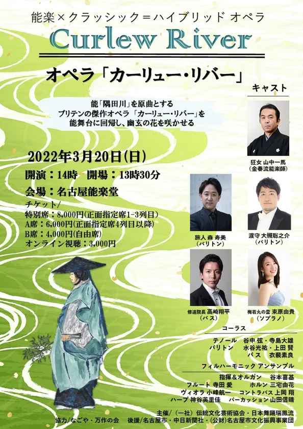 一般社団法人伝統文化芸術協会(所在地:愛知県日進市、代表:瑞鳳 澄依)は、オペラ『カーリュー・リバー』を、能楽とクラシックを融合させた「ハイブリッドオペラ」として2022年3月20日に、名古屋能楽堂で開催することをお知らせいたします。