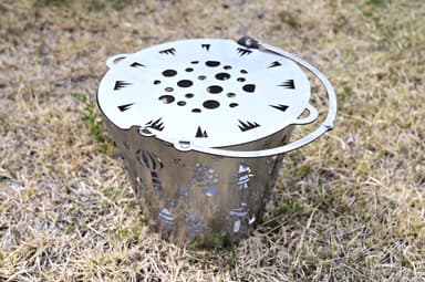 バケツ型の焚き火台もユニークですが、そこに可愛らしいモチーフが切り抜かれ、他には無い焚き火台になりました。