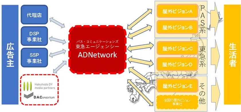 株式会社東急エージェンシー(本社:東京都港区 代表取締役 社長執行役員:澁谷 尚幸、以下 当社)は、株式会社パス・コミュニケーションズ(本社:東京都千代田区 代表取締役社長:星野 二朗、以下 PAS)と構築してきた屋外大型ビジョンのアドネットワークに、2022年3月より株式会社博報堂DYメディアパートナーズ(本社:東京都港区 代表取締役社長:矢嶋 弘毅、以下 博報堂DYメディアパートナーズ)、株式会社博報堂DYアウトドア(本社:東京都港区 代表取締役社長:水野 勝太 以下 博報堂DYアウトドア)、デジタル・アドバタイジング・コンソーシアム株式会社(本社:東京都渋谷区 代表取締役社長 CEO:島田 雅也、以下 DAC)の3社が提供するプログラマティック広告商品「BRAND VIEW OUTDOOR AD(以下 BVOA)」との接続を開始いたします。