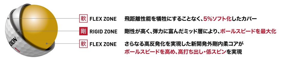 「スリクソン X3」専用設計の飛び特化型「REBOUND FRAME」構造は、ボールスピードを最大化する”軟(コア)剛(ミッド)軟(カバー)”の3層構造です。新開発の外剛内柔コアがボールスピードを高め、高打ち出し・低スピンを実現し、ミッド層でボールスピードアップをサポートします。ドライバーでとにかく飛ばしたいゴルファーにおすすめです。また、カバー部分は前作より5%ソフト化し、ソフトな打感を体感いただけます。