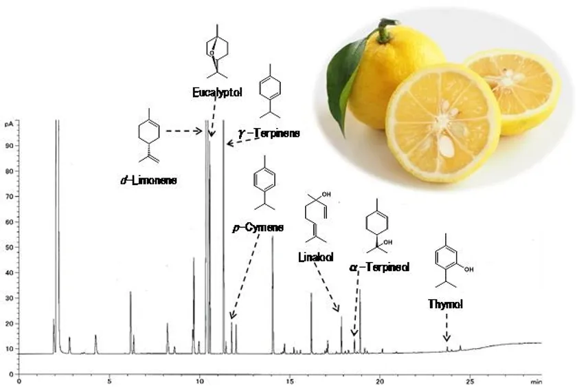 ・柚子パウダーTEには、柚子由来の様々な香気成分が含まれています(図)。その主要な成分は、テルペノイド(d-Limonene、Eucalyptol、γ-Terpinene、p-Cymene、Linalool、α-Terpineol、Thymol)であり、本製品はこれらのテルペノイドの経時的な劣化が抑制された、保存安定性の高い粉末であることが特徴です。