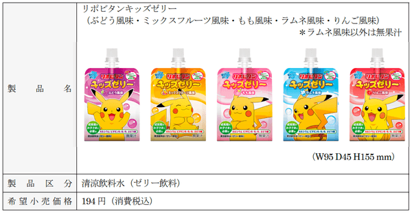 「リポビタンキッズゼリー」は、成長期のお子さまに必要な栄養素であるビタミンB1・B2・B6、カルシウムを配合したストロー付きアルミパウチ容器の清涼飲料水(ゼリー飲料)で、2021年1月の発売以来、お子さまに人気のTVアニメ「ポケットモンスター」のイラストパッケージを採用し、ご好評をいただいております。ぶどう風味(無果汁)の発売を皮切りに、ミックスフルーツ風味(無果汁)、もも風味(無果汁)、ラムネ風味、りんご風味(無果汁、一部企業限定)を発売し、お子さまの好みに合わせてお選びいただけるラインナップを揃えております。2024年4月には新たに、ひとくちタイプのリポビタンキッズゼリー(生菓子)を発売するなど、お子さまに喜んでいただけるよう、様々な改良を重ねてまいりました。