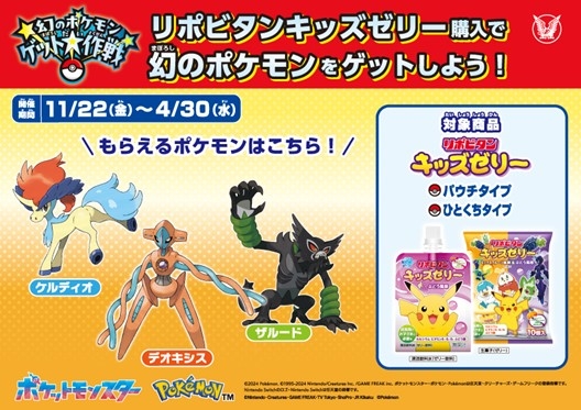 大正製薬株式会社[本社:東京都豊島区 社長:上原 茂](以下、当社)は、株式会社ポケモンが企画するキャンペーン「幻のポケモン ゲット大作戦」に「リポビタンキッズゼリー」シリーズで参加いたします。
