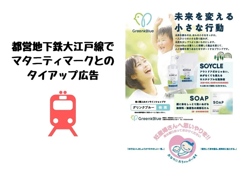 天然成分を使った製品を通じて、あなたのサステナブルライフをサポートする『ナチュラルブランドGreenkBlue(グリンクブルー)』は、厚生労働省が進めるマタニティマークとのタイアップ広告を掲出し、2022年3月7日(月)から都営地下鉄大江戸線の連結部分にてスタートいたしました。