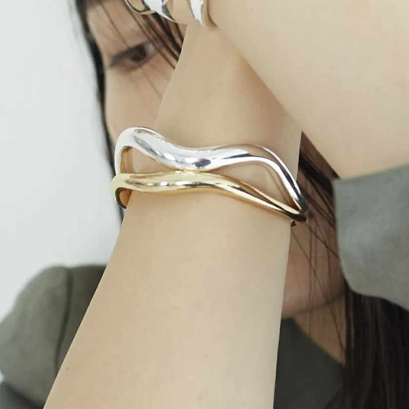 重ね付けをしているかのような2本のニュアンスラインが特徴的なバングル。使い勝手の良さそうなシルバー×シルバーとシルバー×ゴールドの2タイプあり、いずれもカジュアルにも上品にも決まるデザインです。手持ちのブレスレットや細目のバングルとの重ね付けもおススメ。シルバー特有の黒ずみを感じた時はクロスなどで優しく拭き取ればOKです。軽やかな装いが春の日差しに映える頃、手首から覗くバングルは、季節先取りのお洒落さんに見せてくれるこなれアイテムです。