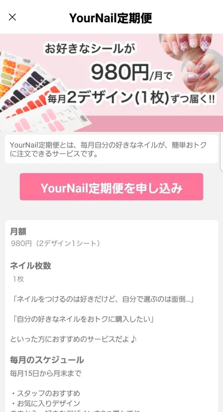 YourNailアプリ内でYourNail定期便お申し込みいただくと翌月より定期便が開始となります。お申し込み後、月末までに好みのデザインをお選びください(オリジナルデザインもお選びいただけます)。