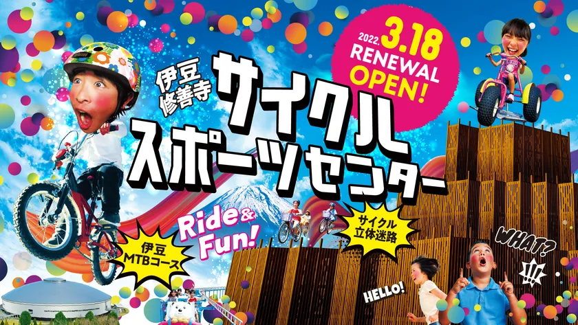 静岡県伊豆市のスポーツ施設、伊豆修善寺 自転車の国 サイクルスポーツセンターは、2022年3月18日にリニューアルオープンいたします。あの世界的競技大会の開催に伴って休園しておりましたが、新たな施設をラインナップに加えて、この春いよいよリニューアル。コロナ対策も万全に、さらに楽しくさらに魅力的に生まれ変わったサイクルスポーツセンターで、皆さまのご来園を心からお待ちしています!
