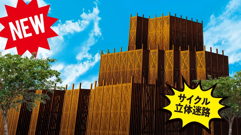 この春、サイクルスポーツセンターに自転車の形をした立体迷路が登場!体力コースと知力コースの2つのゾーンがあり、どちらのコースも迷いながら正しい順路を発見し、一路ゴールをめざすワクワク感を仲間や家族の皆さんで感じていただける迷路です。