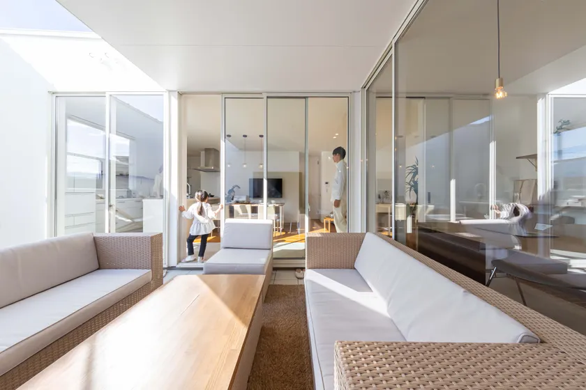 GLAMP最大の特徴は、家の中にいながら感じることができる圧倒的な開放感です。アウトドアリビング、屋内リビング、ダイニング、キッチンで構成された空間は、大きなガラス窓から視界が抜け、GLAMPの目印である十字窓や、屋根の半分が開いているアウトドアリビングの空へとつながり、想像以上の広がりを感じることができます。