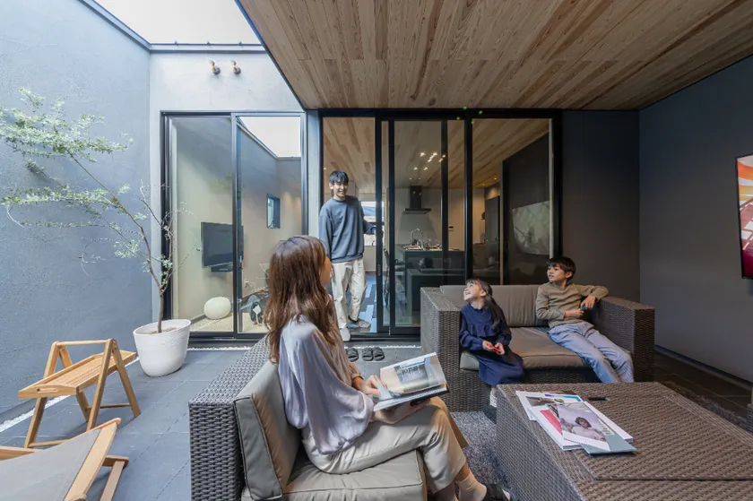 外空間を利用した開放感あふれるリビング部分