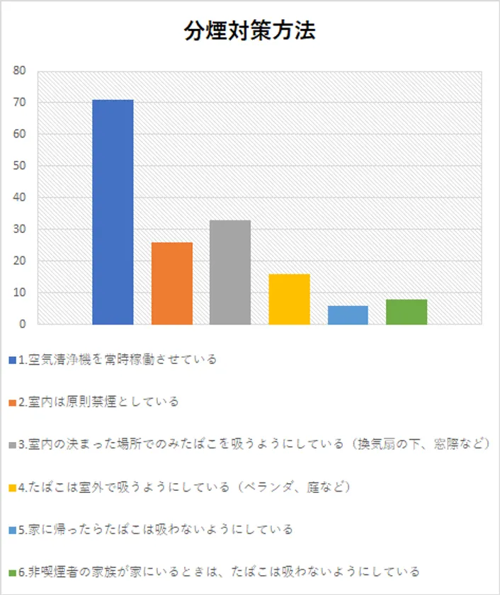 この回答データからわかるように、喫煙者がいる家庭の多くで分煙対策が行なわれています。具体的な方法については以下のような回答が寄せられました。