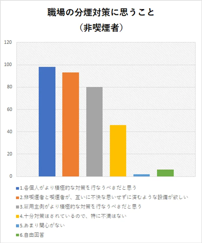 このように非喫煙者は「各個人での積極的な対策が必要」という意見が多い一方、喫煙者は「雇用主側がより積極的に対策すべき」といった意見が目立っています。