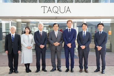 左から多久市観光協会 会長 野中氏、佐賀県産業労働部 企業立地課副課長 吉原氏、多久市副市長 荒瀬氏、多久市長 横尾氏、当社代表取締役社長 本田、株式会社タクア 代表取締役 外間氏、多久市まちづくり協議会かつやく隊 隊長 笹川氏