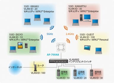 5GHz帯 / 2.4GHz帯 それぞれ4個のSSIDを同時に動作させることが可能で、IEEE 802.1Q準拠のタグVLAN機能にも対応しています。これら機能の組み合わせにより、部署ごとのネットワークや、社内無線LANとゲスト無線LANを分割することができます。
