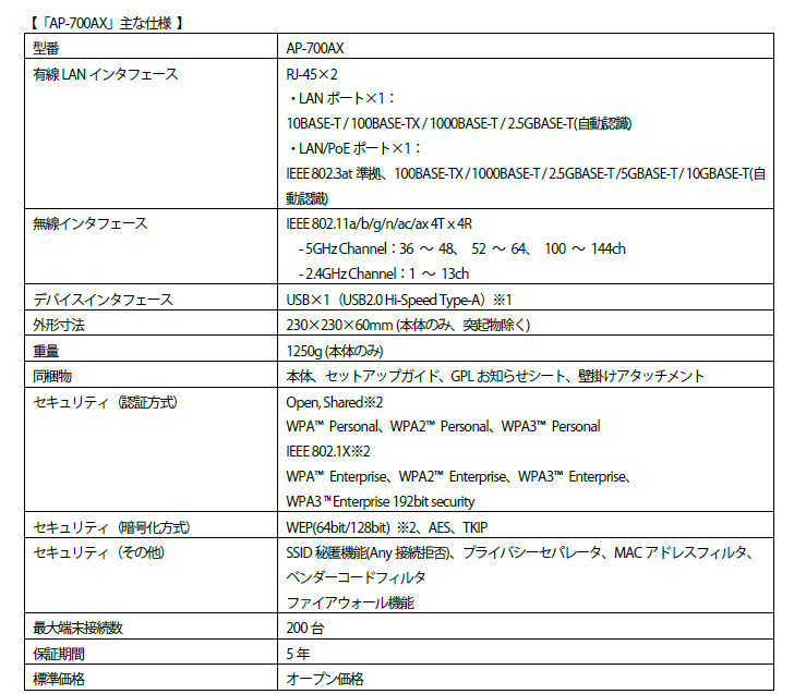 サイレックス、Wi-Fi 6対応 業務用無線LANアクセスポイント 「AP-700AX」を新発売
