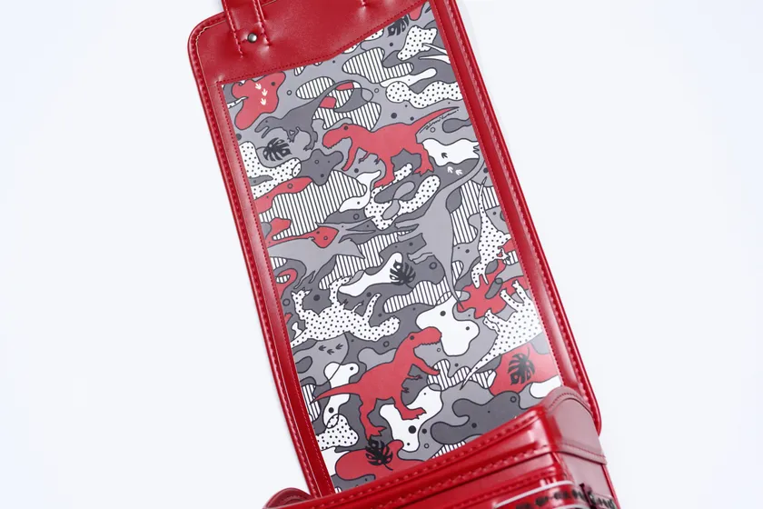 カブセ裏には4種類の恐竜が隠れた迷彩柄が描かれており、前ポケットにはカブセ裏と同じ柄をエンボス加工し、細かい部分までこだわり、他には無い個性的でカッコいいランドセルになっています。
