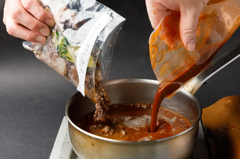 このデミグラスソースと合わせるのは、一頭買いしているA4等級黒毛和牛のブリスケ(前バラのパーツ)。通常のバラと比べ赤身感が強く、上質な脂が程よく入った部位で、デミグラスソースとの相性も抜群です。この牛肉スライスを自家製「ハイシソース」と絶妙に絡み、本物の牛肉感も味わえるカットを追求し0.1mm単位で調整。今回は1.2mmスライスのお肉をたっぷり使用しています。最適な焼き加減で調理した「黒毛和牛と赤ワインのレデュクション」をミールキットの付属セットとして提供します。