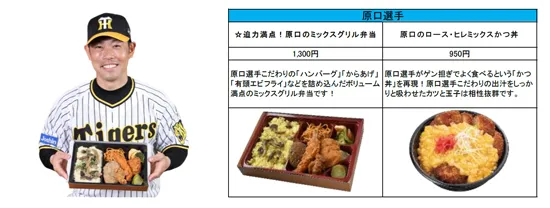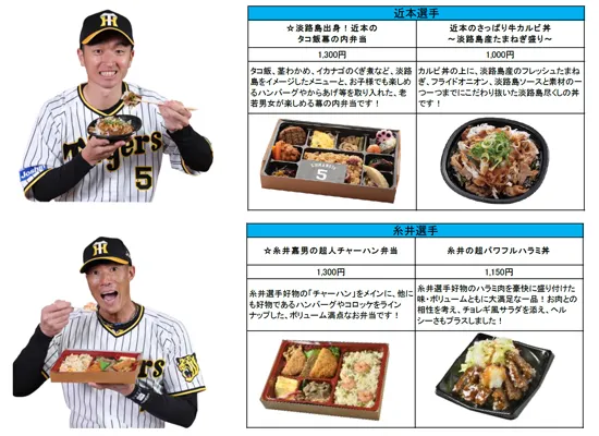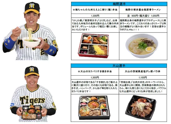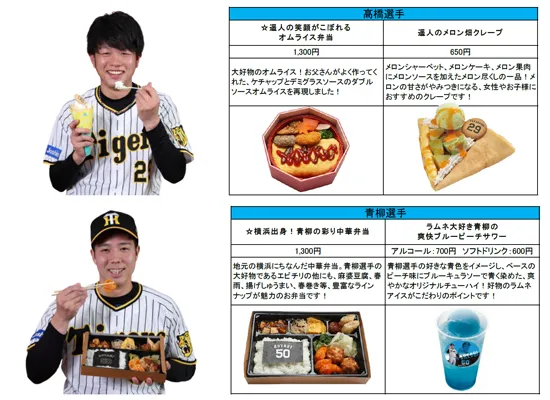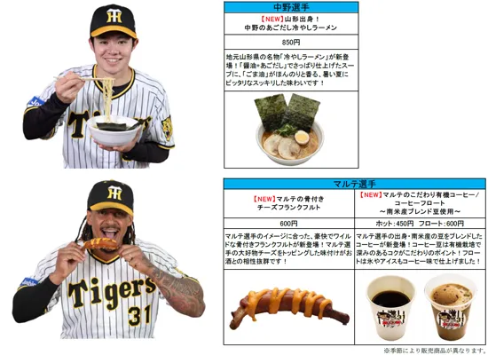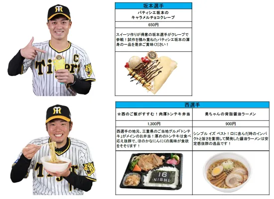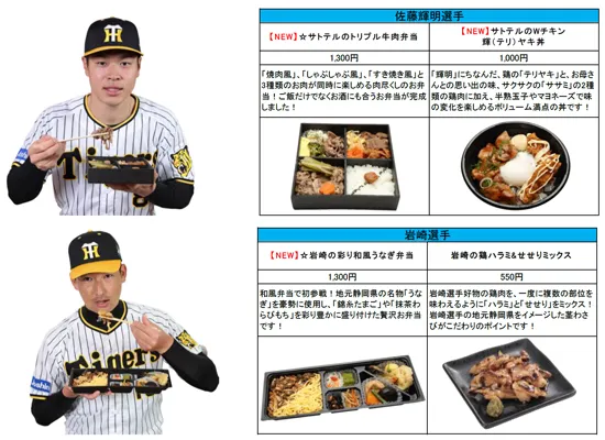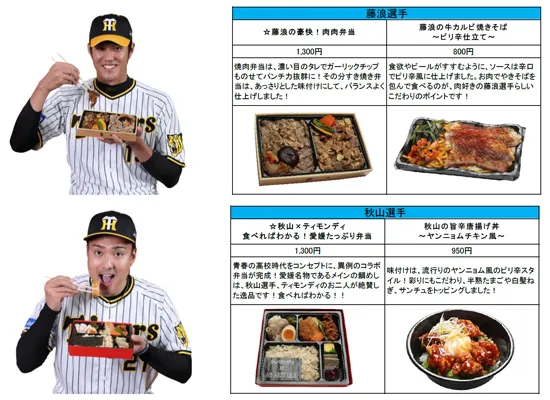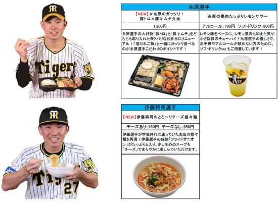 今シーズンは、2年目も活躍が期待される佐藤輝明選手の名前にちなんだ「サトテルのWチキン輝(テリ)ヤキ丼」や、ピリ辛とチーズの相性が抜群の「伊藤将司のとろ~りチーズ担々麺」等、8選手の新たなメニューが登場します!計23名、35種類以上の充実のラインナップを是非お楽しみください。