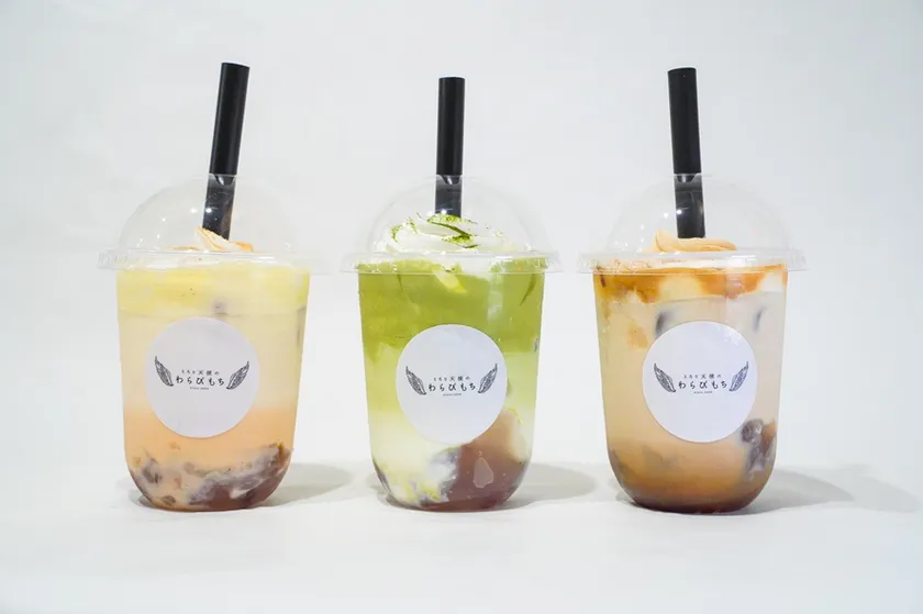 とろとろ食感のわらびもちをストローで飲む新食感のドリンクです。伝統的な和菓子のわらびもちに生クリームとドリンクを合わせ、洋風スイーツにアレンジしました。一番人気フレーバーは黒蜜です。