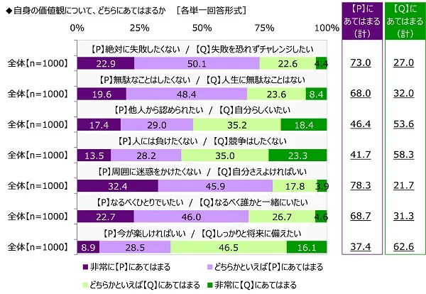 まず、全回答者(1,000名)に、価値観に関する考え方を2つずつ提示し、それぞれどちらにあてはまるか聞いたところ、【”絶対に失敗したくない“と”失敗を恐れずチャレンジしたい”】では『絶対に失敗したくない(計)』(「非常に」と「どちらかといえば」の合計、以下同様)が73.0%、『失敗を恐れずチャレンジしたい(計)』が27.0%となり、【”無駄なことはしたくない“と”人生に無駄なことはない”】では『無駄なことはしたくない(計)』が68.0%、『人生に無駄なことはない(計)』が32.0%となりました。若者世代には、安定性や効率性を重視する傾向があるためか、失敗や無駄を避けたい人が多いようです。