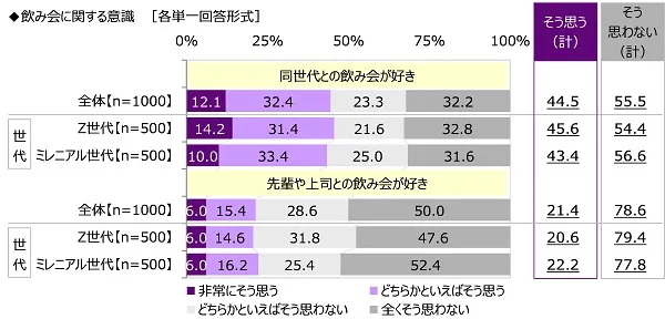 世代別にみると、飲み会では先輩や上司の考えを聞きたいと思う人の割合は、Z世代では43.8%と、ミレニアル世代(37.2%)と比べて6.6ポイント高くなりました。