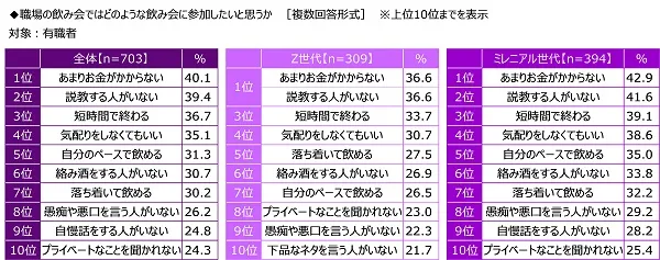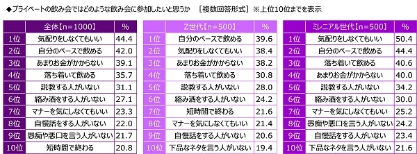世代別にみると、Z世代では「自分のペースで飲める」(39.6%)が1位、ミレニアル世代では「気配りをしなくてもいい」(50.4%)が1位でした。