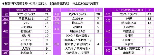 世代別にみると、Z世代・ミレニアル世代とも「マツコ・デラックスさん」がダントツ、Z世代では2位「ムロツヨシさん」、3位「松本人志さん」、ミレニアル世代では2位「タモリさん」「明石家さんまさん」となりました。