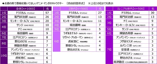 また、お酒の席で愚痴を聞いてほしいアニメ・マンガのキャラクターを聞いたところ、「ドラえもん(ドラえもん)」がダントツ、2位「竈門炭治郎(鬼滅の刃)」、3位「モンキー・D・ルフィ(ONE PIECE)」、4位「サンジ(ONE PIECE)」「ナミ(ONE PIECE)」と続きました。