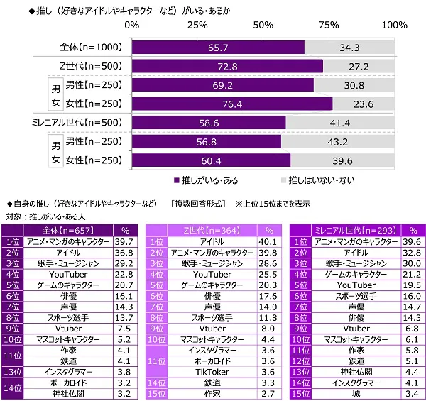 Z世代1位は「アイドル」、ミレニアル世代1位は「アニメ・マンガキャラ」