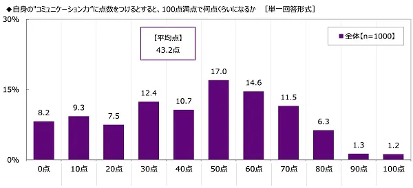 全回答者(1,000名)に、自身の”コミュニケーション力“に点数をつけるとすると、100点満点で何点くらいになるか聞いたところ、「50点」(17.0%)が最も高くなり、平均点は43.2点でした。