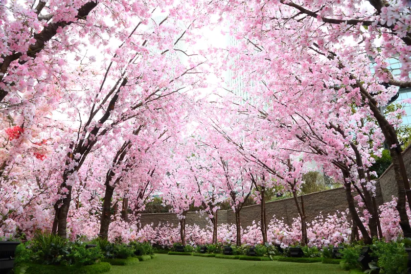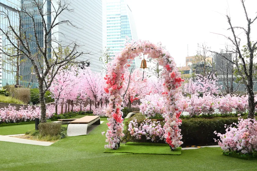 都会の空中庭園 5F「スカイガーデン」が、期間限定で桜をモチーフにした「サクラスカイガーデン」として、都会の春を彩ります。夜は、ピンクとホワイトのLEDでライトアップ致します。