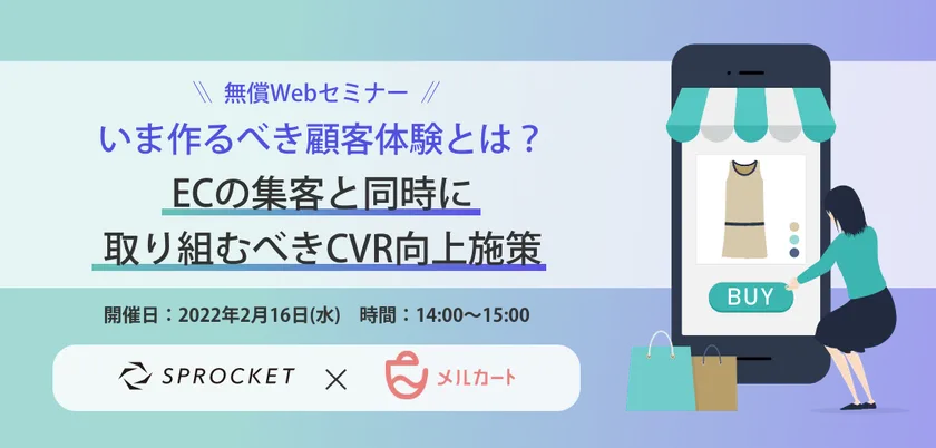2022年2月16日(水)、クラウド型ECプラットフォーム「メルカート」を提供している株式会社エートゥジェイ(本社:東京都港区、代表取締役社長:飯澤 満育)は、CRO(コンバージョン率最適化)プラットフォーム「Sprocket(スプロケット)」の開発・提供・運用を行う株式会社Sprocket(本社:東京都目黒区、代表取締役:深田 浩嗣)と「いま作るべき顧客体験とは?~ECの集客と同時に取り組むべきCVR向上施策~」と題し共同オンラインセミナーを開催しました。