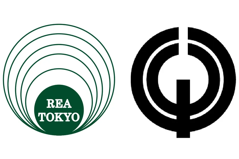 東京都不動産鑑定士協会ロゴマーク(左)、清瀬市市章(右)