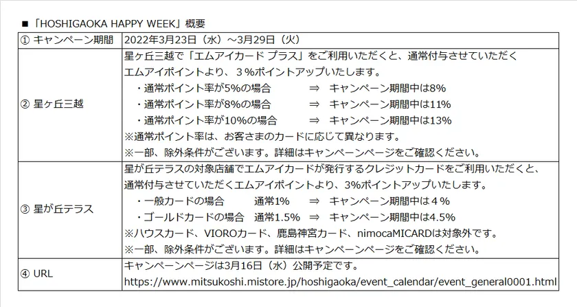 サービス開始にあたり、3月23日(水)~3月29日(火)の期間中、星ヶ丘三越と星が丘テラスにてポイントアップキャンペーン「HOSHIGAOKA HAPPY WEEK」を開催いたします。星が丘エリアのお買い物をいつもよりお得にお楽しみいただける1週間です。